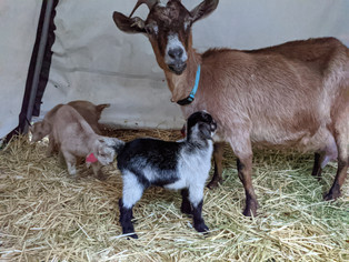We have been waiting for a long time for Kismet to have her babies. Well Saturday evening was the day! We left for about 4 hours and when we came back she had 3 kids with her! Two doelings and a buckling. All 3 are big and healthy, no wonder she's been so uncomfortable! Poor lady. Then Sunday night we couldn't find Misty only to discover she had hidden herself in the bushes to have her first baby. 4 babies born in two days. Buckling 1 isn't particularly thrilled about giving up his only kid status but he's slowly coming around.